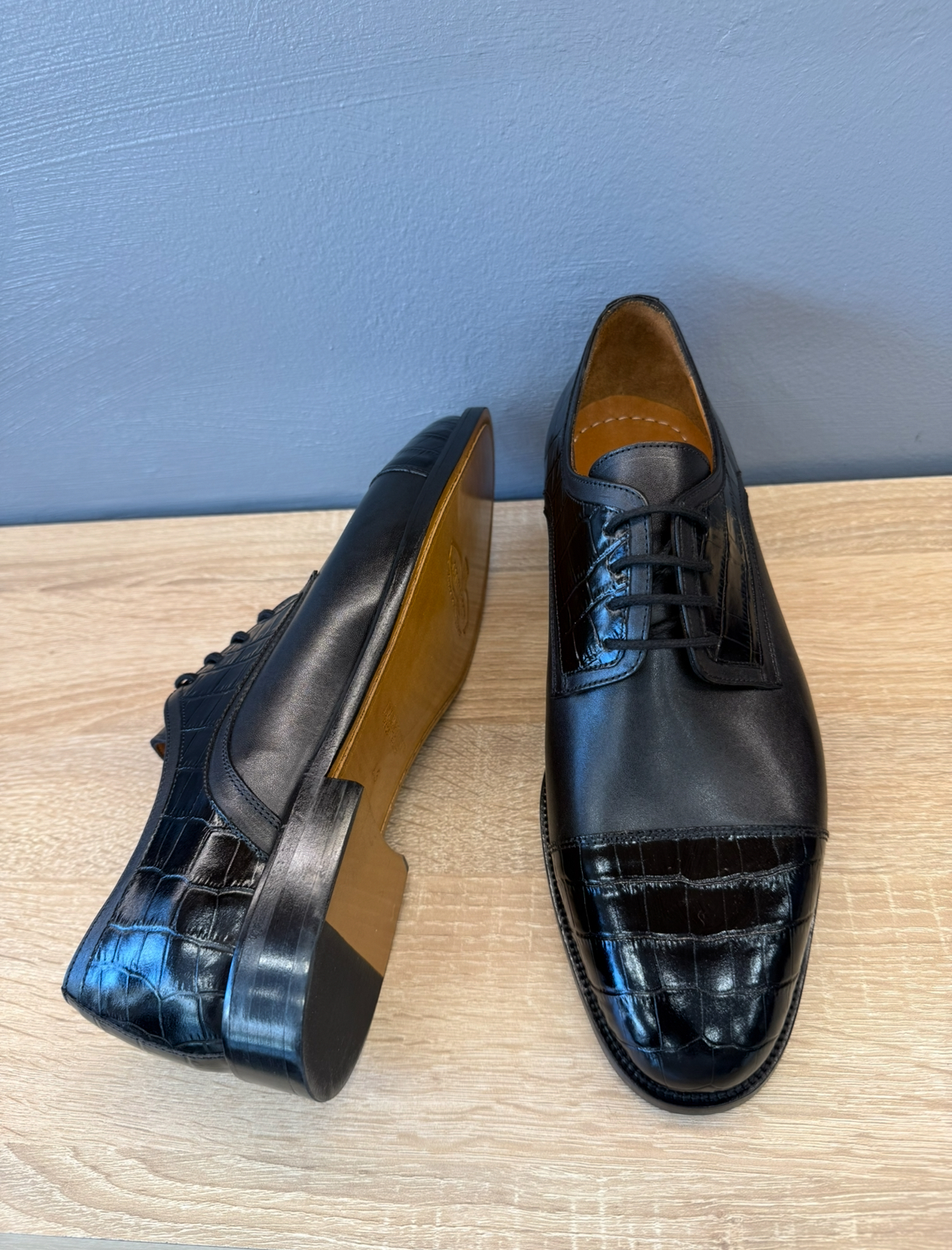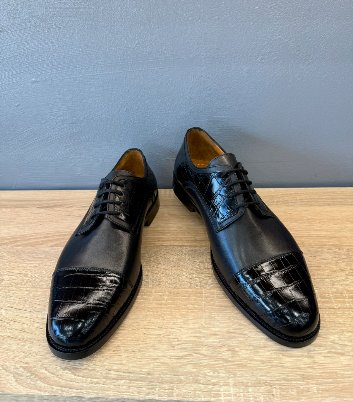 The shoes is crafted from a mix of materials—a smooth croco leather surface. This textured element adds a layer of sophistication and luxury to the otherwise sporty silhouette