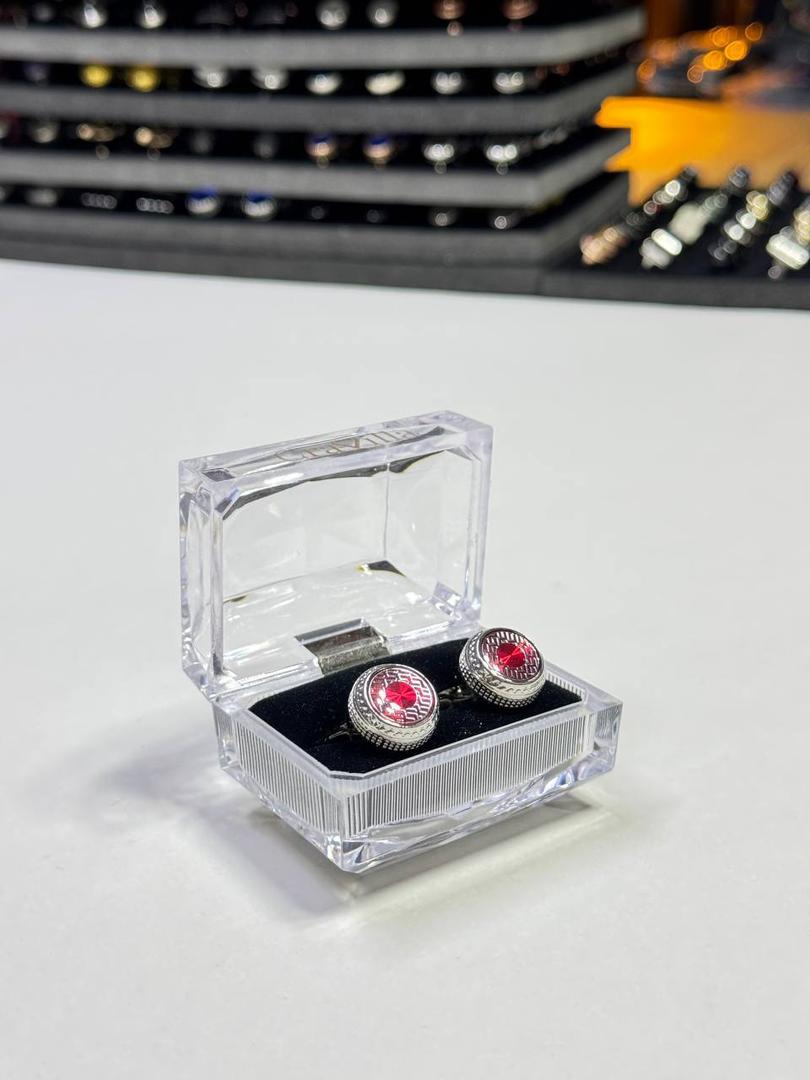 These cufflinks pair a polished silver-tone finish with a deep faceted centre stone for a clean, tailored look.